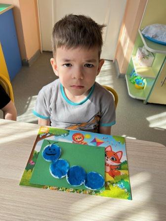 На занятии ребята делали аппликацию из ватных дисков «Гусеница». Перед выполнением работы рассмотрели изображение гусеницы, поговорили как выглядит гусеница. Выяснили что гусеницы могут быть однотонными, но разного цвета, гладкими или мохнатыми. У гусеницы есть маленькие ножки: шесть основных и еще несколько “запасных” лапок-помощников.По образцу воспитателя составляли выполняли работу: целое изображение из нескольких маленьких частей. По работы с клеем раскрашивали гусеницу по своему усмотрению. Посмотрите какие красивые у нас получились гусеницы.