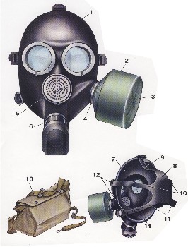 Противогаз состоит из лицевой части (маски, шлем-маски), фильтрующе-поглощающей коробки, которые соединены между собой непосредственно или с помощью соединительной трубки.
