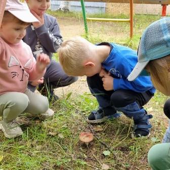 Воспитатель организовала для малышей интересное занятие на свежем воздухе — на участке в березовой роще выросли грибы, и дети смогли рассмотреть их и узнать о них много нового. Целью мероприятия было не только познакомить детей со съедобными и несъедобными грибами, но и научить их отличать их друг от друга.