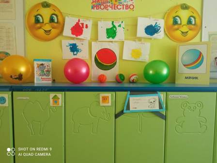 Занятие по рисованию на тему «мяч» началось с игровой деятельности. Дети брали в руки мяч и определяли его размер, какой он, большой или маленький. В процессе игры мы познакомились со стихотворением «я с мячом играть люблю», также рассмотрели ряд картинок и познакомились, что мяч округлой формы. Закрепили основные цвета (желтый, красный, синий, зеленый). Воспитатель на мольберте показал детям приемы и способы разукрашивания кистью. Затем дети приступили к самостоятельной деятельности – раскрасили контур изображения мяча на листе бумаги, при помощи воспитателя. Выполняя данную работу, у малышей развивается мелкая моторика рук и их координация. В конце занятия рассмотрели выставку выполненных работ.