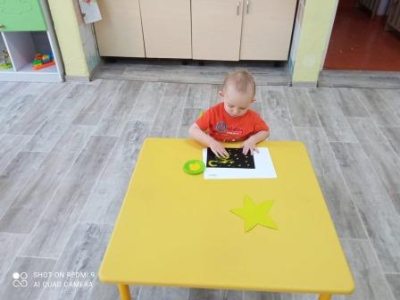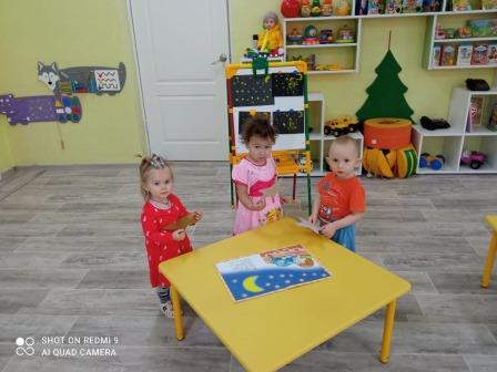 Для рисования ночного неба используем нетрадиционную технику, такую как рисование пальчиками. Перед началом рисования мы провели беседу по картинкам книжки с изображениями звездного неба, что обычно ночью все спят в своих кроватках. Сегодня мы будем рисовать такое звездное небо. Звезды находятся на небе далеко от нас, поэтому кажутся маленькими. Месяц похож на рожок. Будем использовать светло-желтый цвет. Выдаем ребенку лист черного картона, в емкость наливаем желтую гуашь. Показываем пример, как окунуть палец в краску и ставить точку на листе, в процессе работы оказываем помощь детям. В конце занятия обсудили получившиеся работы, похвалили за старания и сказали каждому, что у всех получилась своя особенная картина.
