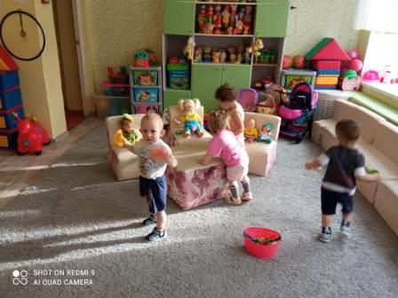 Подвижная игра, где дети собирают разложенные на полу погремушки в корзинки. Она помогает развивать координацию движений, ловкость и внимательность, а также учит действовать по команде или в сопровождение музыки. Мы разложили около кукол погремушки и поставили корзинки, при это воспитатель показывает, что можно взять игрушку и прыгать. Кто-то из детей бегал друг за другом, кто-то стоял и игрался, выполнял движения руками. На палас разложили погремушки и предложили их собрать в корзинки. Малыши с большим удовольствием поиграли и повеселились.