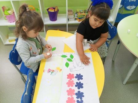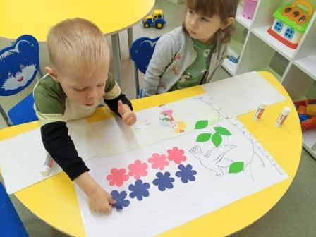 Творческие занятия: Дети с большим удовольствием мастерили аппликацию российского флага. Старательно подбирали цвета и клеили цветочки, создавая вместе свой маленький символ большой страны!