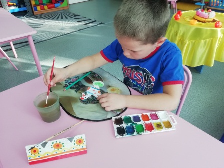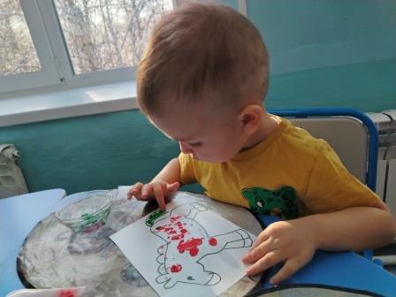 Целью занятия было научить ребят аккуратно пользоваться гуашевыми красками (аккуратно макнуть пальчик в баночку с краской и сделать отпечаток на туловище лошадки, не выходя за контур).