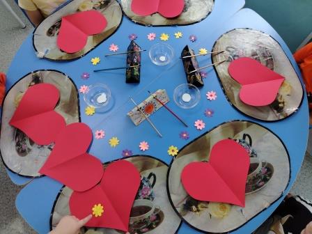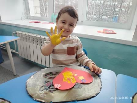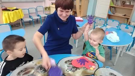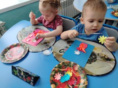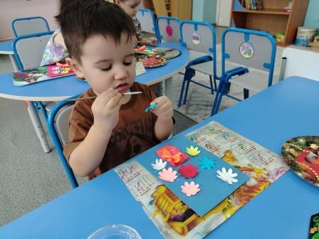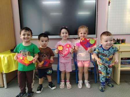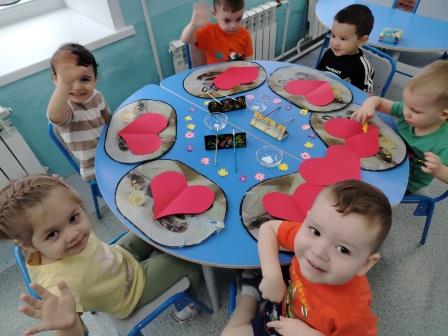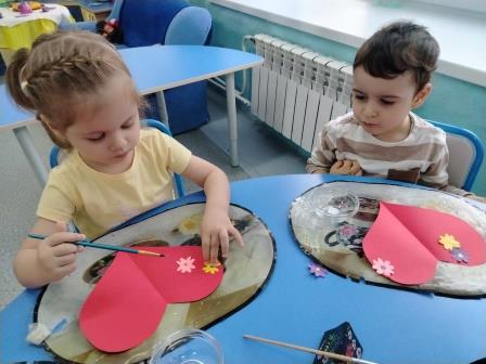 Ребятам были предложены заготовки в виде сердечка, а затем они брали кисть, наносили клей на обратную часть цветка и старались аккуратно приклеить к открытке, чтобы получился букетик. В середине открытки малыши сделали отпечаток своей ладошки разноцветными красками.