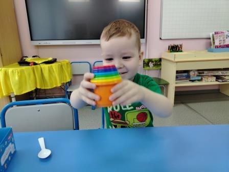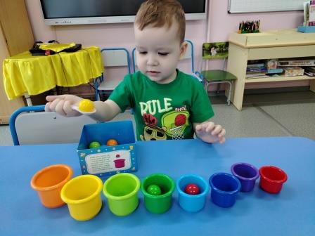 В формировании разносторонне развитой личности ребенка играм отводится важнейшее место, так как игра является основным средством и методом воспитания. Она сопровождает детей в течении всего времени пребывания в детском саду. Дети любят играть с пирамидками, вкладышами, кубиками, разными сортерами. Особенно им нравится игра со стаканчиками и шариками. Игра предполагает множество вариантов. Например, я даю задание взять шарик желтого цвета и положить в желтый стаканчик и т.д. Так закрепляем цветовосприятие. Если ребенок хорошо закрепил цвета, то для закрепления можно дать следующее задание: возьми красный шарик и помести в фиолетовый стаканчик и т.д.. Еще вариант игры: для изучения предлогов между, на, под, перед, за и ориентировкой в пространстве: - поставь желтый стаканчик перед красным, синий за красным, зеленый между фиолетовым и голубым.