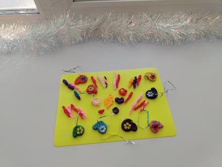 Еще слепили на елку сосульки, использовав воздушный пластилин. Этот материал тоже мягкий и податливый, с ним легко работать. Несмотря на малый опыт, ребята проявили фантазию, и у них здорово получалось лепить колечки, сердечки, фигурки, похожие на тающие льдинки. А из сосулек сделали целые гирлянды.