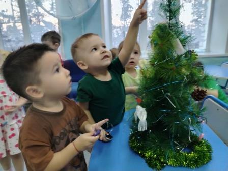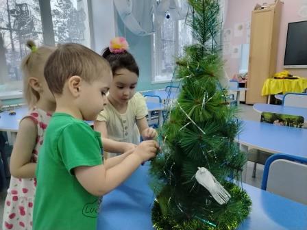 Когда же все украшения были готовы и пришло время украшать, то сколько радости можно было наблюдать в глазах малышей. Нарядив елочку, ребята водили хоровод и спели песенку про новогоднюю красавицу.