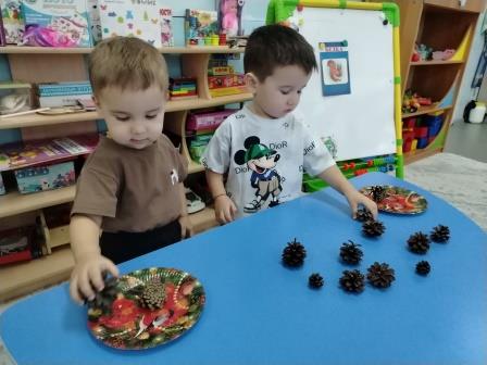 В гости к ребятам пришла лесная белочка и принесла корзинку с шишками. Провели беседу. Ребята отвечали на вопросы гостьи. Где живет? Чем питается? Как делает запасы? Какое любимое лакомство? Оказалось, что шишки, точнее их семена. Ребята рассмотрели их, потрогали руками, определили, что шишек много. Ребята заметили, что в корзинке есть большие шишки и маленькие. Белочка попросила помочь разложить их по тарелочкам: в одну - большие, а в другую - маленькие.