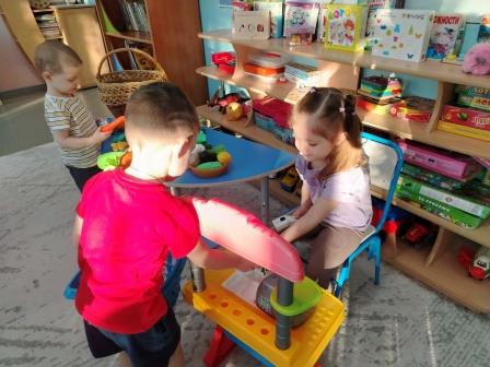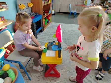 Одна из любимых сюжетно-ролевых игр детей «Магазин». В процессе игры дети учатся взаимодействовать со сверстниками и взрослыми, у них развивается диалогическая речь, пополняется словарный запас, дети учатся взаимовыручке. Также дети расширяют знания о профессиях взрослых, а именно о профессии «Продавец», учатся взаимодействию между продавцом и покупателем.