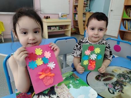 Каждому ребенку хочется сделать подарок своими руками и на помощь приходит воспитатель детского сада. Малыши группы «Солнышко» вместе с воспитателем приготовили открытки для своих мам «Цветы в вазе».