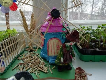 Идея возникла не сразу как оформить подоконник с рассадой, дети сами подсказали мне ее, прося приготовить для них следующий комок глины. А уже потом все вместе придумывали сюжет. Кстати, в работе активное участие принимали родители: сделали и мельницу и усадьбу с колодцем.