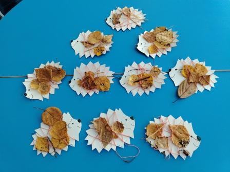 А кто бегает по тропинкам в лесу и цепляет на свои иголки разноцветные листья, веточки и травинки. Конечно же, ежик. К ребятам в гости пришло целое семейство ежей. Они рассказали ребятам об осеннем лесе, а ребята, в свою очередь нарядили ежиков осенним нарядом: листьями, веточками, засохшей травой. Работа несложная: нужно лишь оттянуть ниточку от туловища ежика и просунуть вовнутрь листок. Малышам очень понравилось украшать своего ежика. Они в несколько этапов наряжали своих ежей.