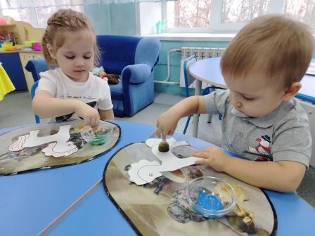 Целью занятия было научить ребят аккуратно пользоваться гуашевыми красками (аккуратно макнуть пальчик в баночку с краской и сделать отпечаток на туловище лошадки, не выходя за контур).