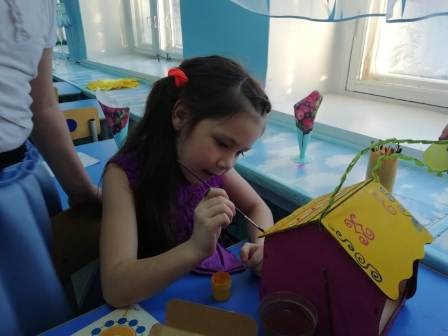 В начале мы проводили беседы: какие птицы остаются зимовать в нашем краю, чем питаются, где прячутся от мороза. Провели конкурс на лучшую модель кормушки: среди нескольких вариантов выбирали лучшие и делали зарисовки. На нашем участке уже висели кормушки, где кормились в прошлые года синички, воробьи, свиристели, но этой зимой нас порадовали своим присутствием красногрудые красавцы снегири. Поэтому мы сделали еще одну кормушку и раскрасили ее, чтобы привлечь птиц. Кормушка получилась на славу: с городецкой, дымковской росписью, нанайскими узорами.